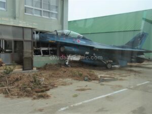 飛行場地区では、まず整然と並んだ状態ながら水没して泥にまみれたF-2戦闘機が目に飛び込んでまいりました。練習部隊ですから規律や整備に厳しい部隊だけに、機体の汚れと、整然と並んだ機体の列線とのギャップが震災の緊急性を物語っていました。