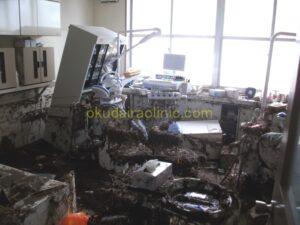 衛生隊舎に入ってみましたが、腹の高さまで津波の後がくっきり付いており、各部屋くまなく泥が溜まっておりました。水没を免れた使用可能な医薬品などの搬出をおこないました。通信が使用できないため、逐一上に確認しての作業は不可能でしたので、手当たり次第に片付け作業をすることで日が暮れていきました。ただし、2,3時間ごとに震度3-4の余震が頻発し、津波警報も発せられるため、その都度高所への退避を余儀なくされました。