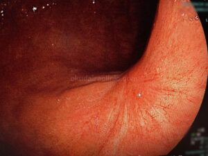 第40病日:退院後の胃カメラ(写真3)。潰瘍の著明な治癒を認めるものの、中心部に脆弱な赤色調の隆起性病変を認める。同部位より生検③。