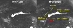 同症例のMRI(MRCP)画像。白く見えるのが拡張した主膵管。この画像では腫瘍は確認できない。